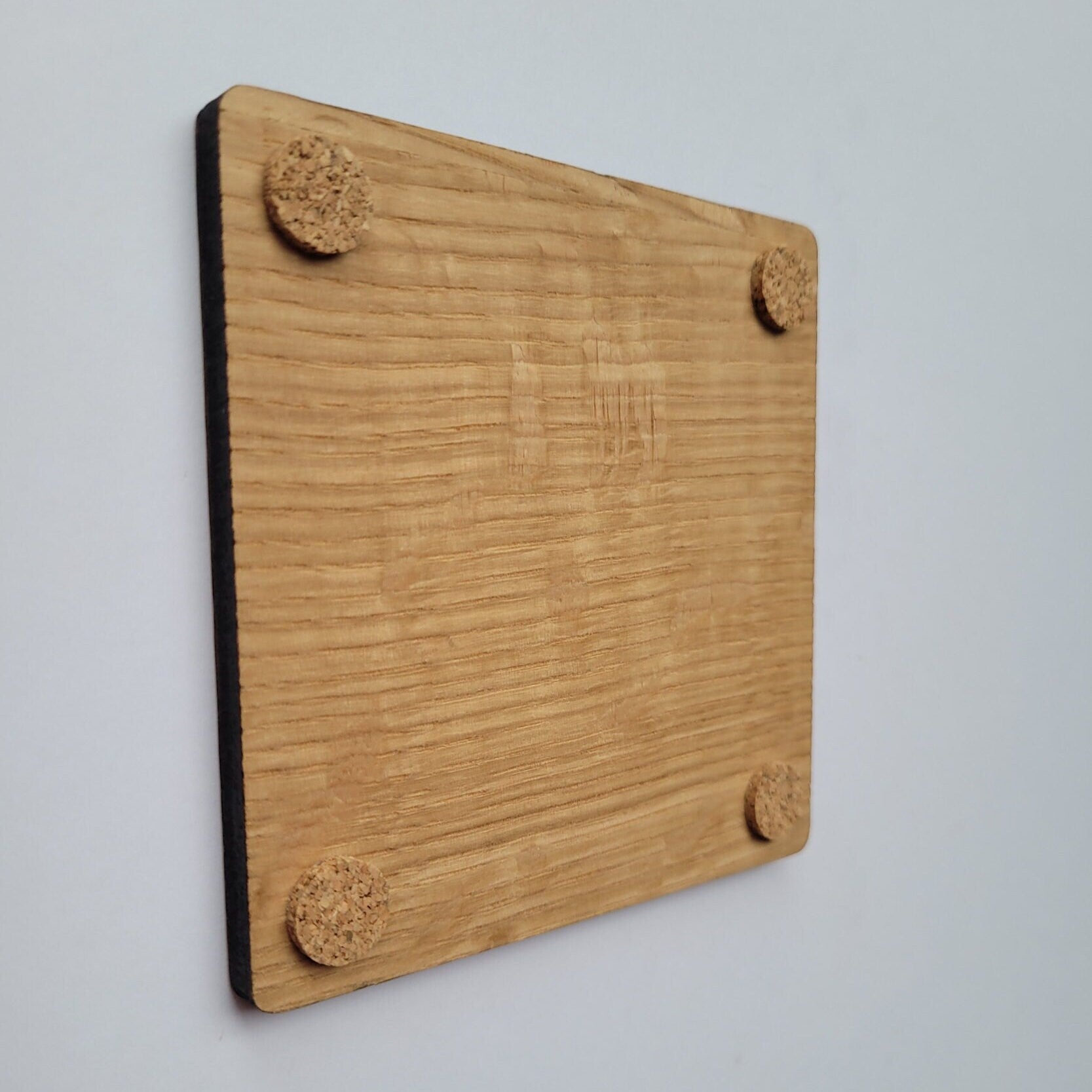 These coasters are 10cm x 10cm big and made from 5mm oak. (Please note wood is a natural product so the finish can vary slightly.)