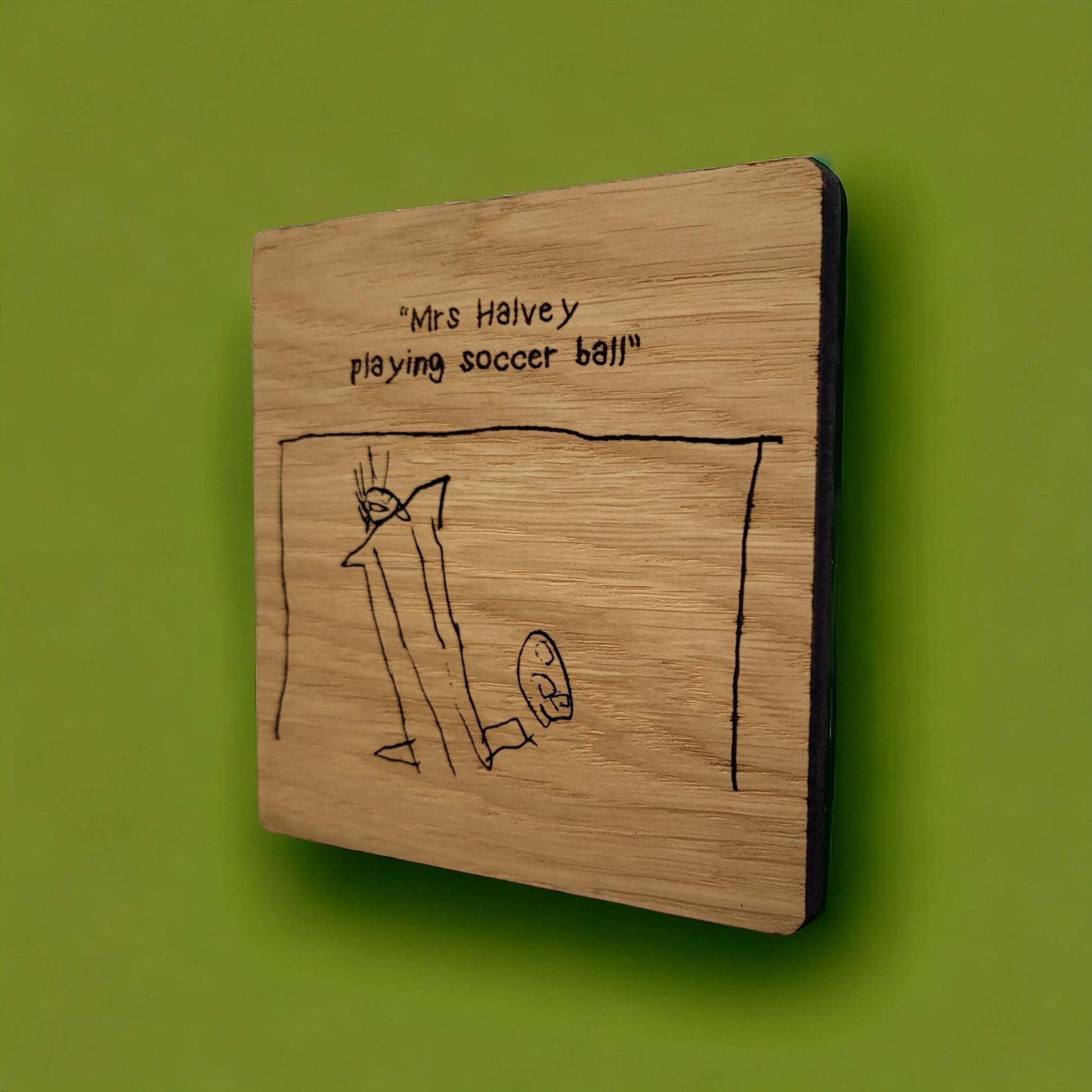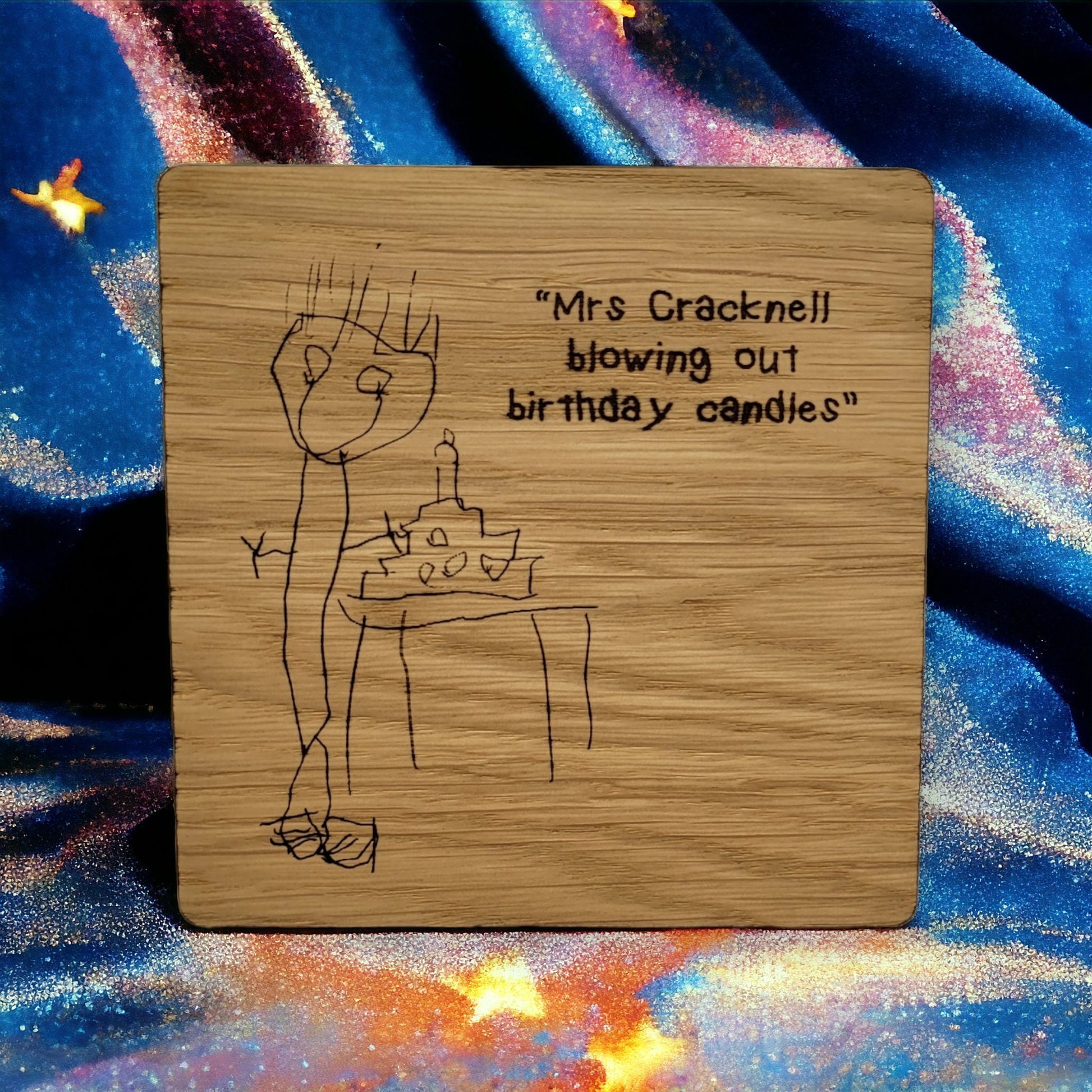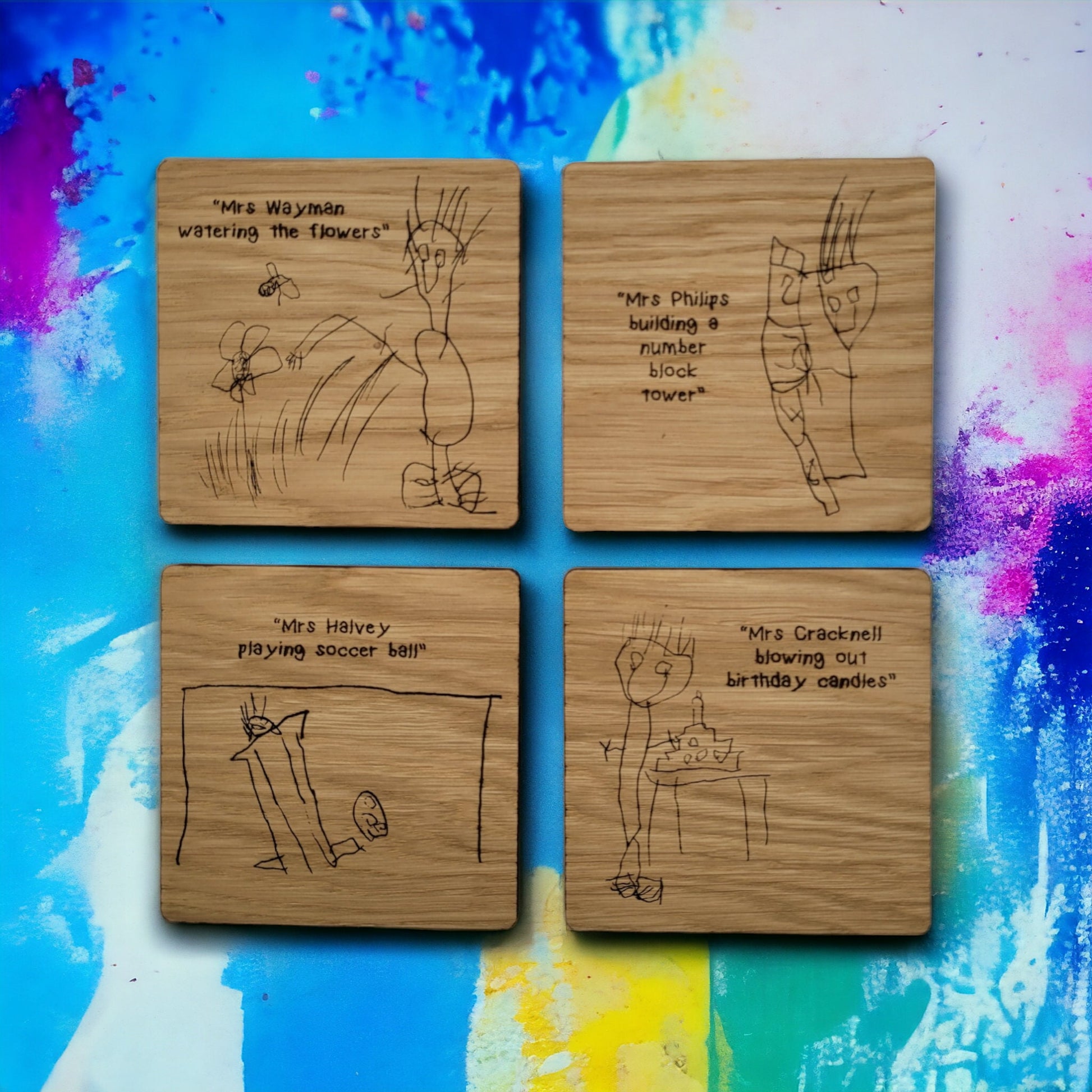 These wooden coasters are engraved with your child's very own artwork. We can add two lines of text to personalise the gift further, making it a perfect present for Mother's Day, Grandma's Birthday or even a teacher's gift.