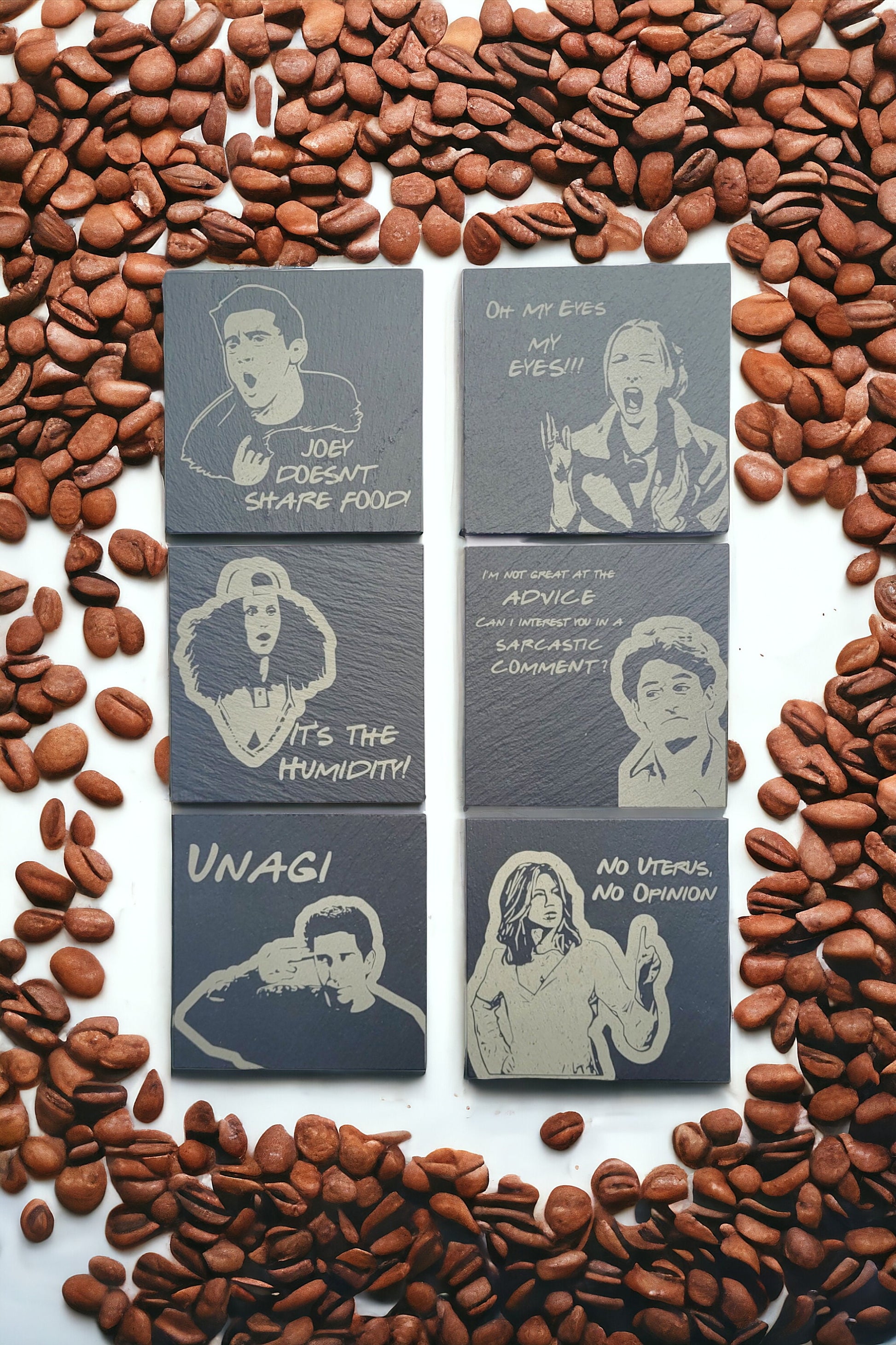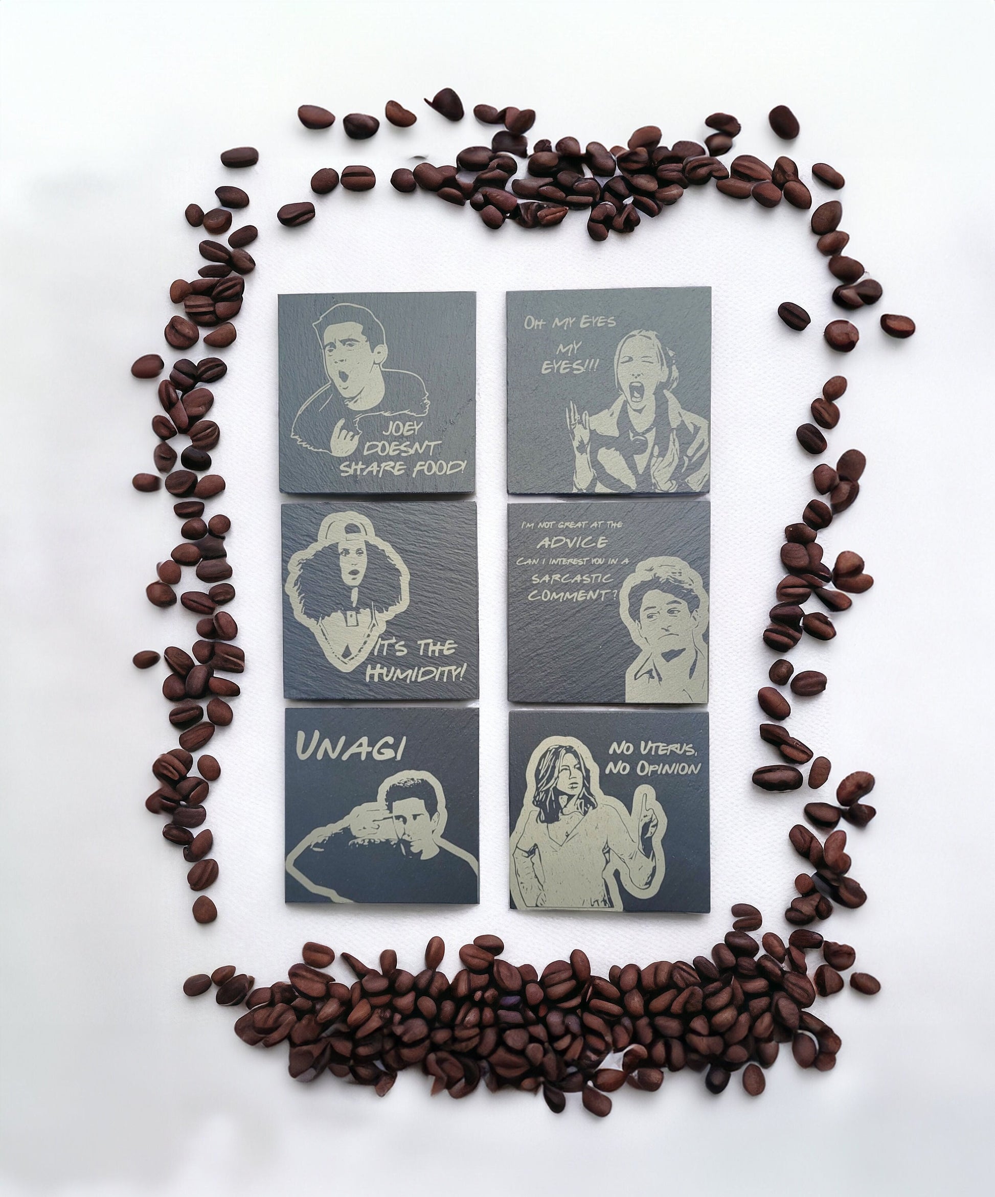 Introducing our F.r.i.e.n.d.s themed coaster set the perfect gift for any fan of the iconic TV show. Featuring all 6 friends and their infamous quotes this set is a brilliant housewarming or Birthday gift.