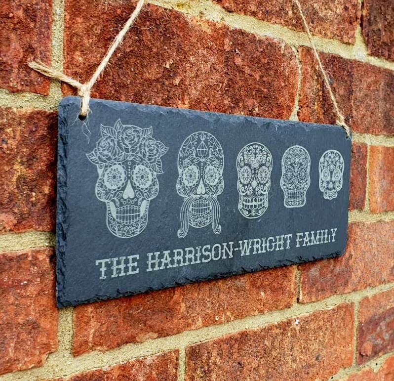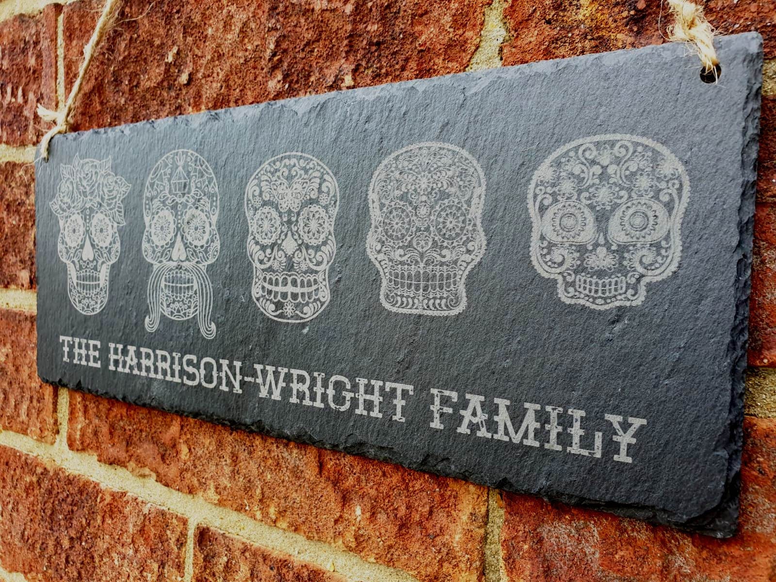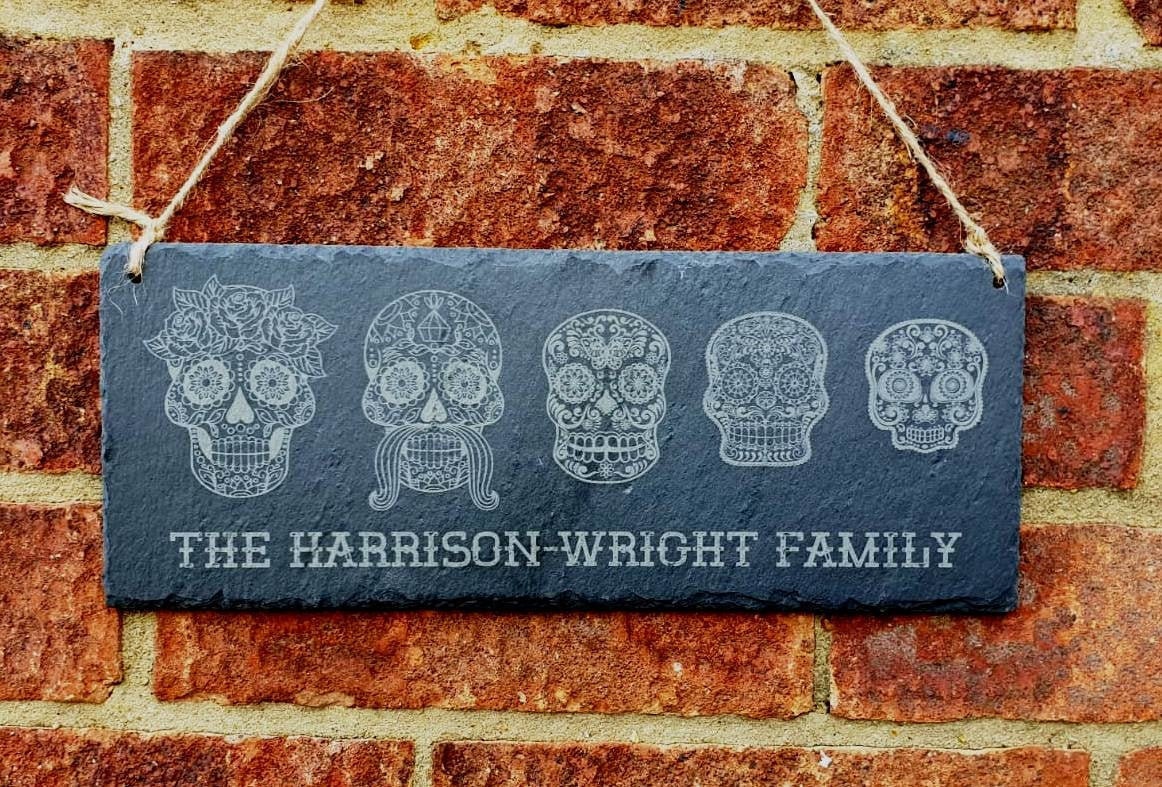 Each custom Sugar Skull Slate is 29cm x 12cm x 5mm in size and hung using twine. Lasering engraving is permanent and it will not fade or wear away giving you a product that will last forever. Pick the skulls (up to 7), on photos 2-4, that you wish to be included in the personalisation box.