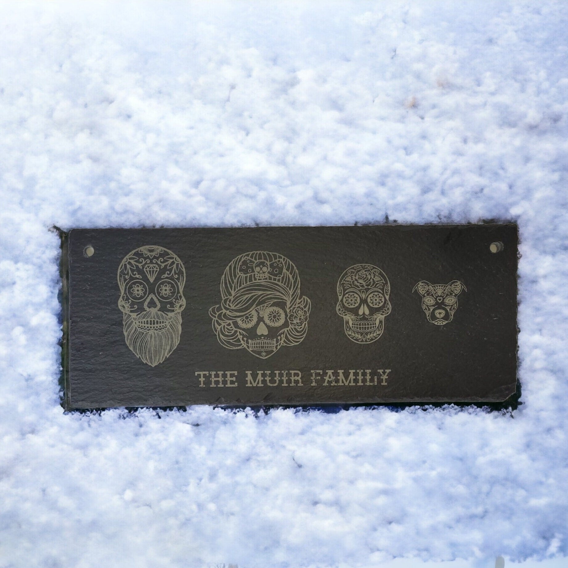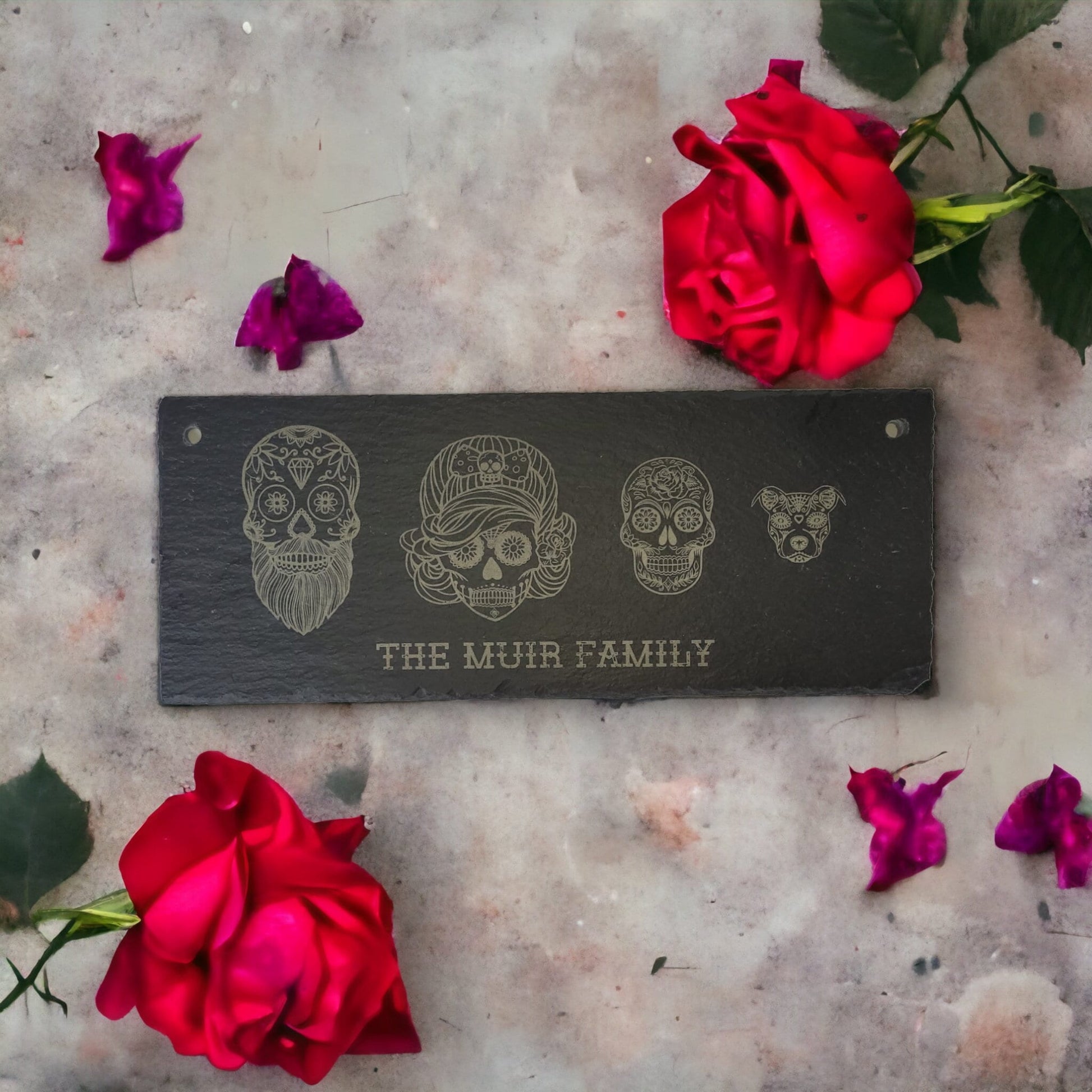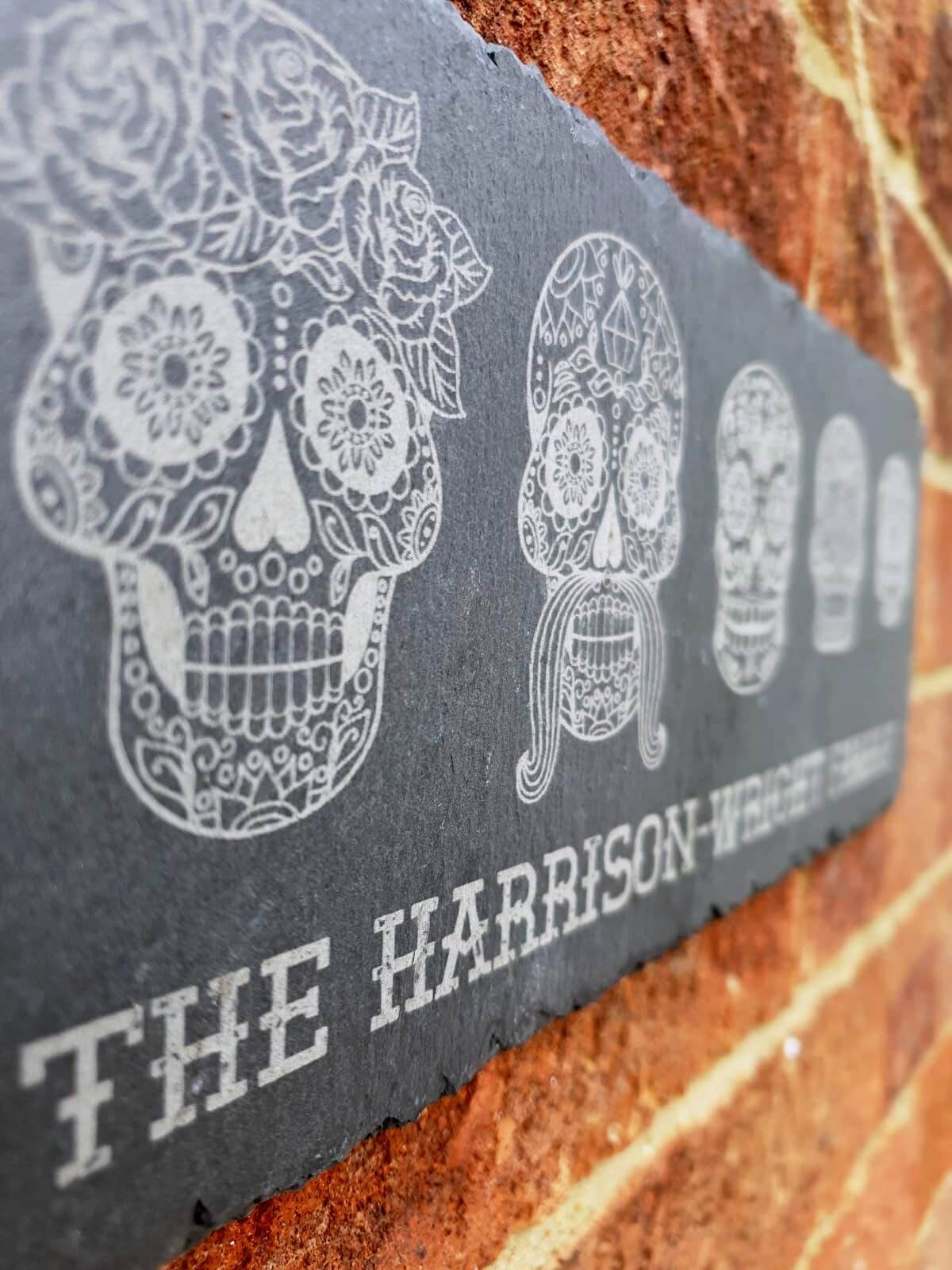 Each custom Sugar Skull Slate is 29cm x 12cm x 5mm in size and hung using twine. Lasering engraving is permanent and it will not fade or wear away giving you a product that will last forever. Pick the skulls (up to 7), on photos 2-4, that you wish to be included in the personalisation box.