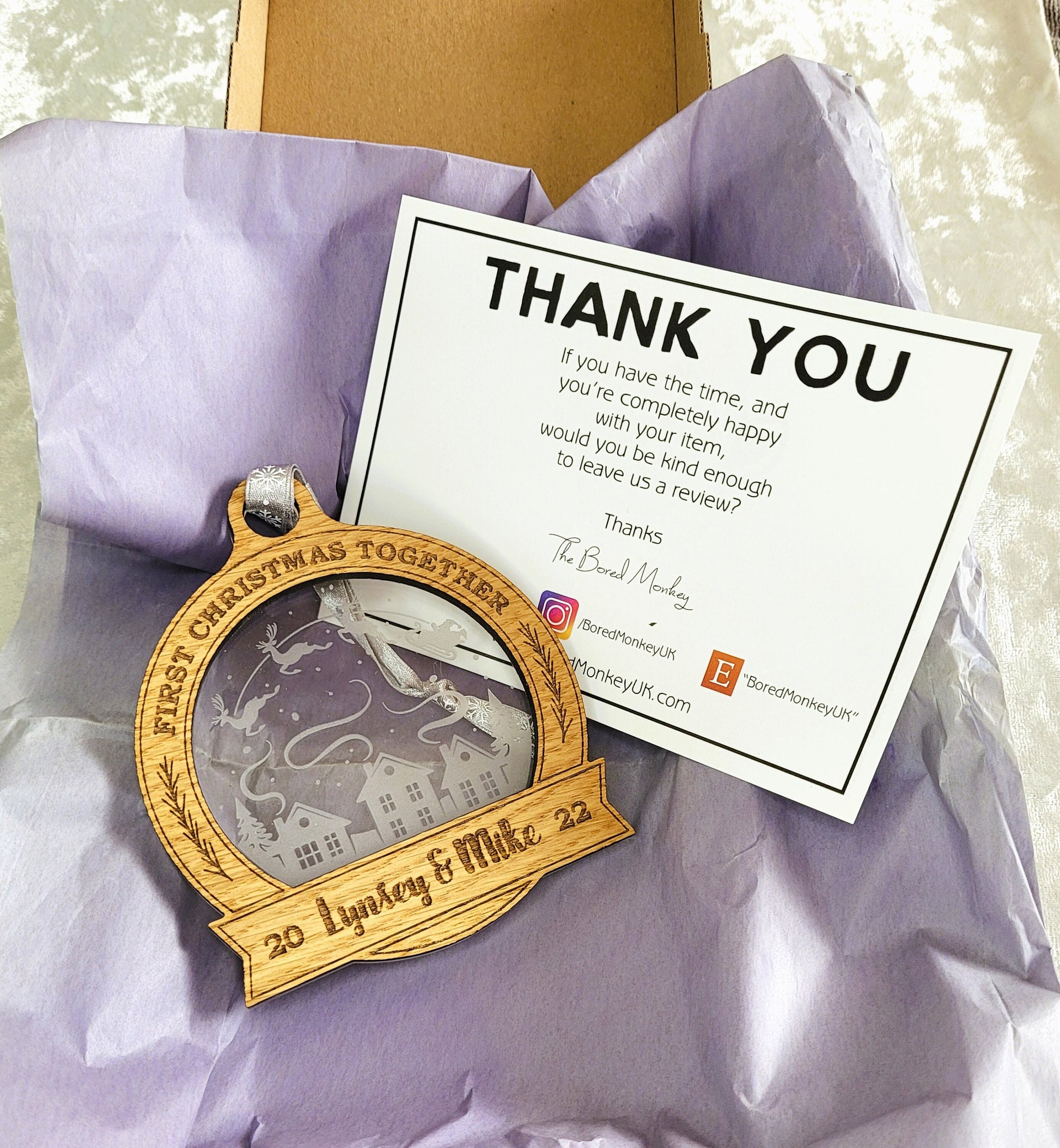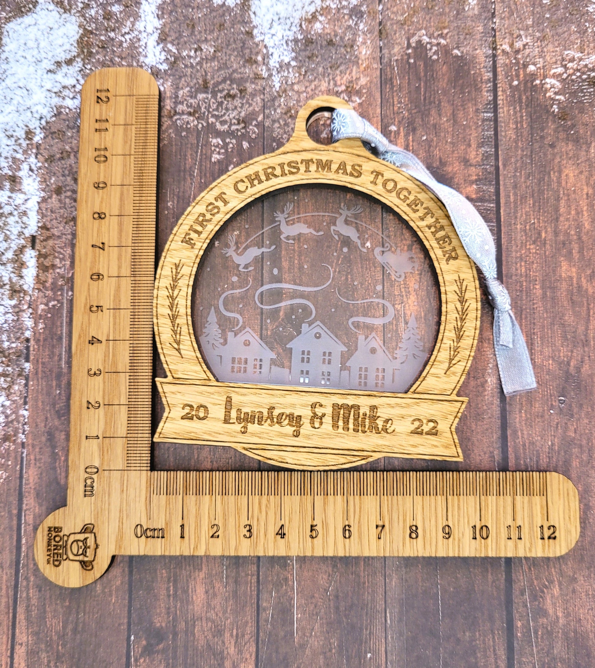 Each decoration is 12cm x 10cm in oak and acrylic, lasered with your personalisation, topped with a festive ribbon and sent in an organza gift bag.