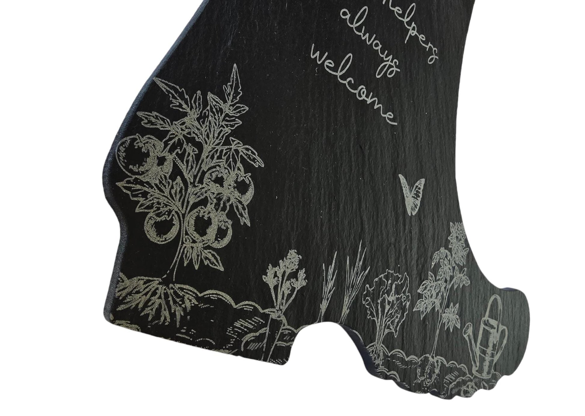 🌿 Features: Handcrafted from durable weatherproof slate and finished with string for hanging. The boot is 26cm x 24cm at its widest points Shaped like a Wellington boot for a fun, garden-inspired design Personalized with a name Suitable for outdoor use in any weather Perfect gift for Grandad, Dad, Grandma, or any garden enthusiast Just let us know the name you want included, add it to your basket and we'll do the rest!