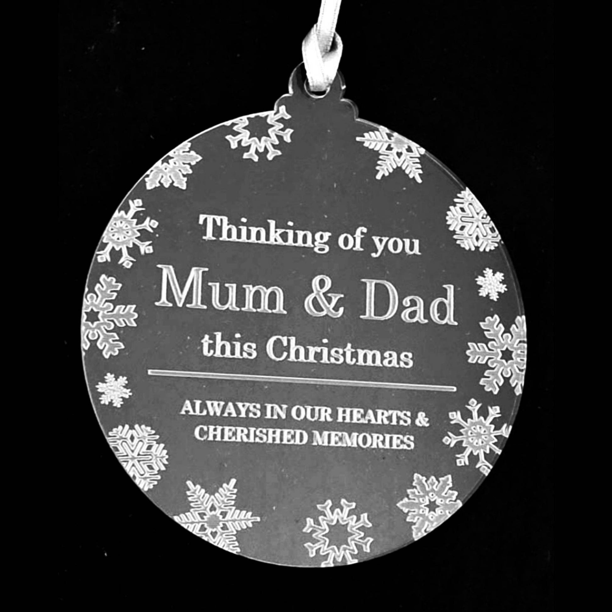 We think it's lovely to remember our loved ones with little trinkets and tributes/ Here we have 9cm x 8cm acrylic baubles, lasered with any name(s) or message you wish. Each one is finished with a silver ribbon and delivered in an organza gift bag.