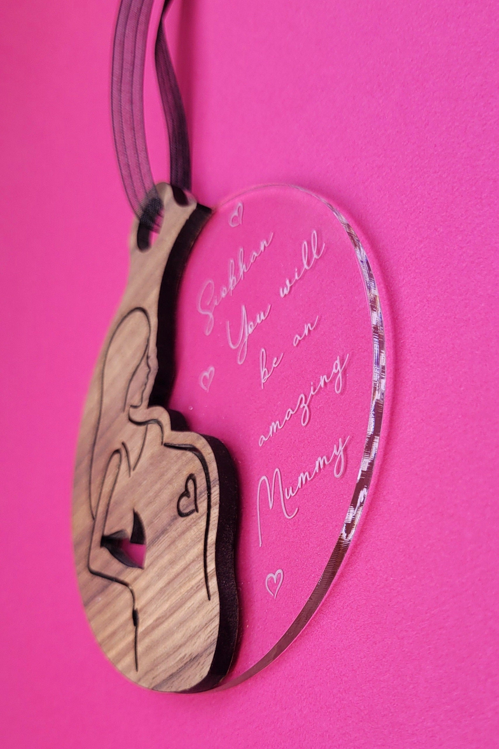 Our walnut wood and acrylic decorations are unique and fully customisable for the mum-to-be in your life.