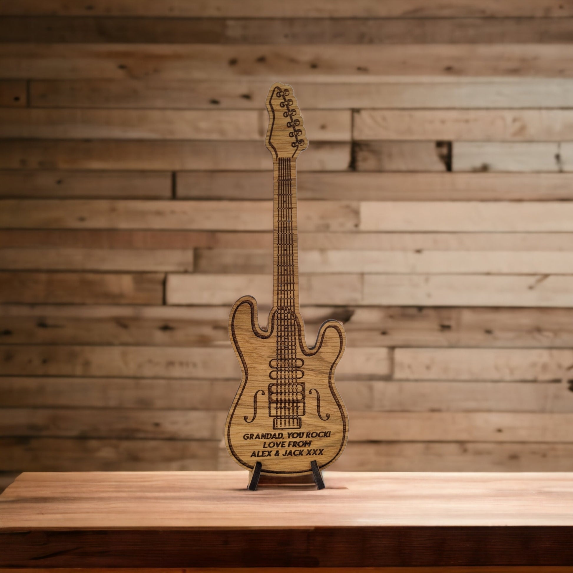 Each guitar comes with little feet/stand so the gift can be displayed with pride. The gift is made from 4mm oak veneered wood and is 8cm by 20cm big.