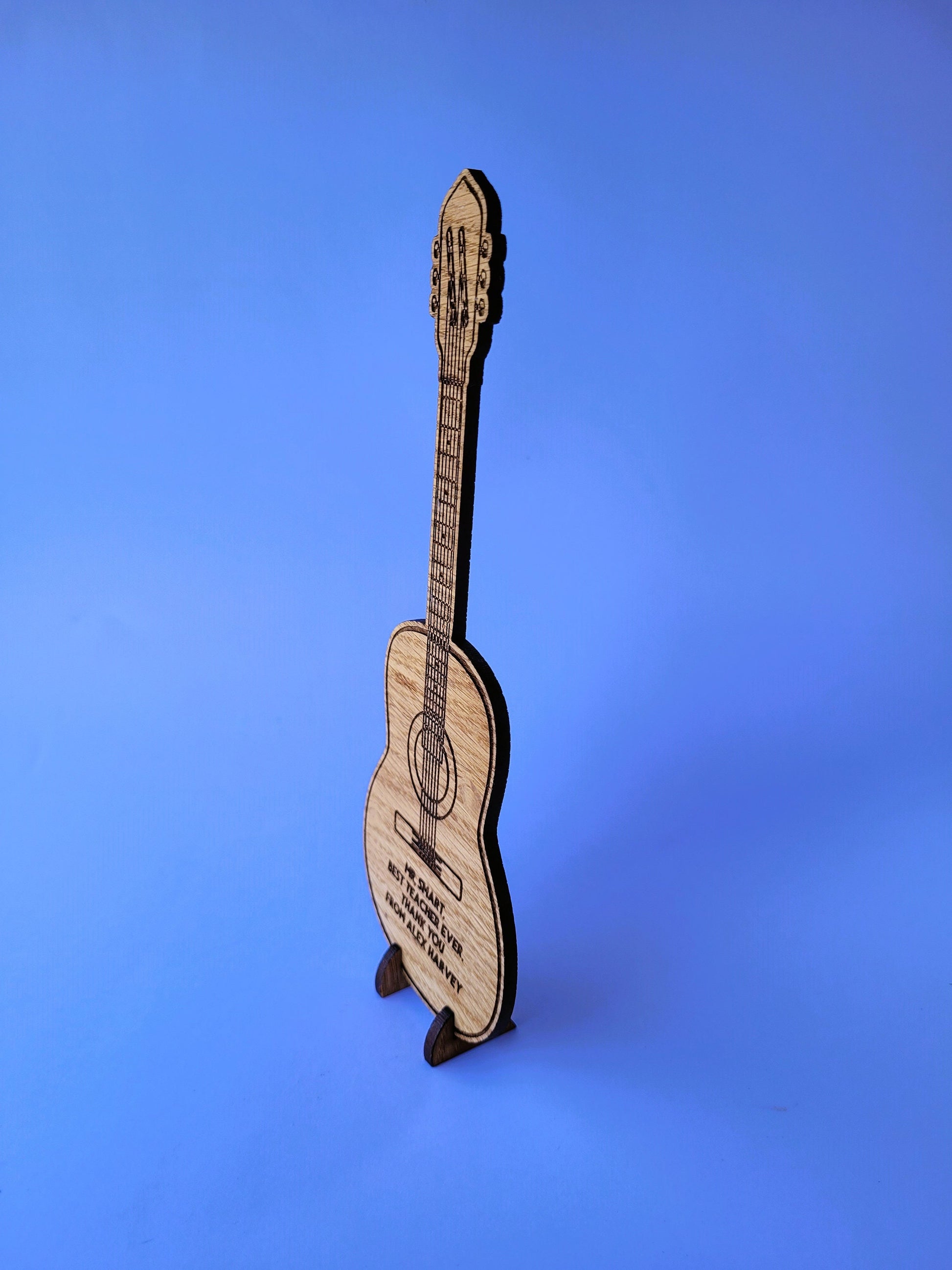 Each guitar comes with a stand so the gift can be displayed with pride. The gift is made from 4mm oak veneered wood and is 8cm by 20cm big.